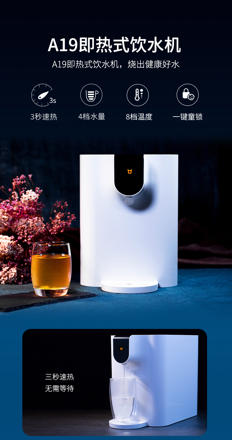 3秒快速加熱出水,轉(zhuǎn)瞬間擁有一杯溫度適宜的新鮮山泉水。8檔水溫可選,4檔水量調(diào)控,安全童鎖更放心,喝出健康鮮活水。