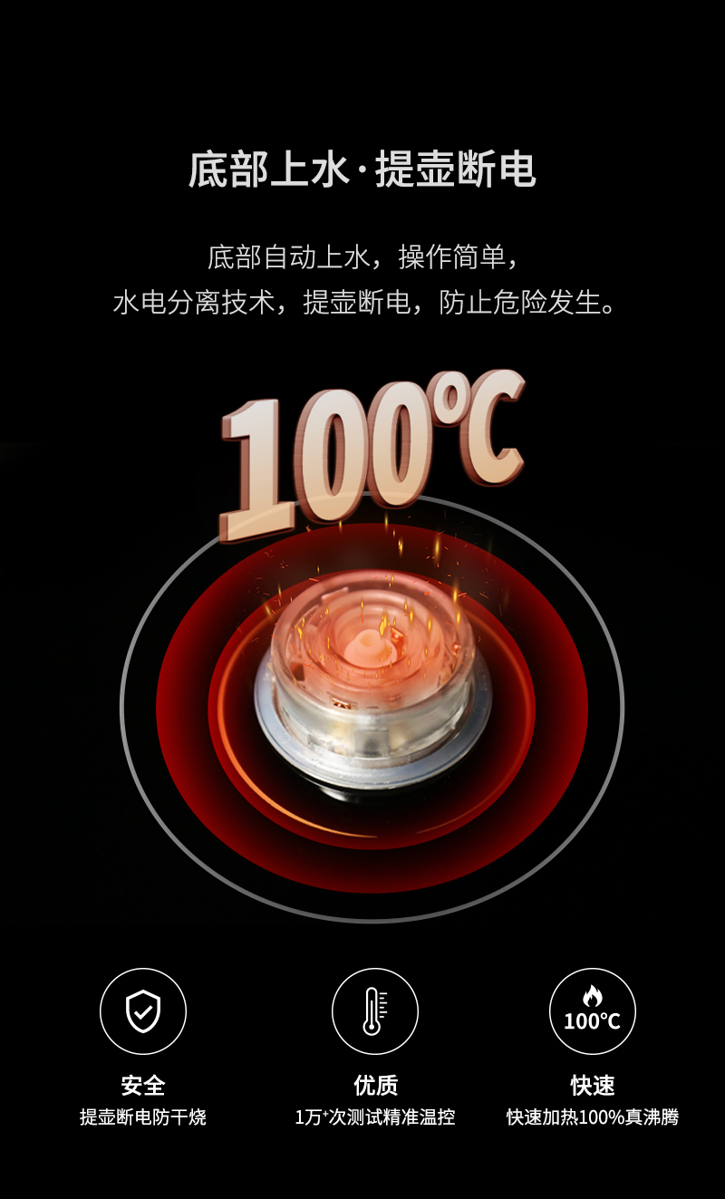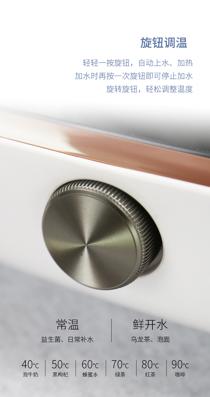 一個鋁合金操作旋鈕,操作一目了然。告別傳統(tǒng)水柱加水,全新升級涌泉式底部上水。智能浮球控制水量,有效杜絕溢水情況。