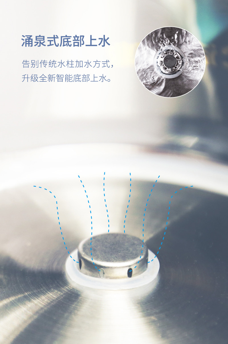 一個鋁合金操作旋鈕,操作一目了然。告別傳統(tǒng)水柱加水,全新升級涌泉式底部上水。智能浮球控制水量,有效杜絕溢水情況。