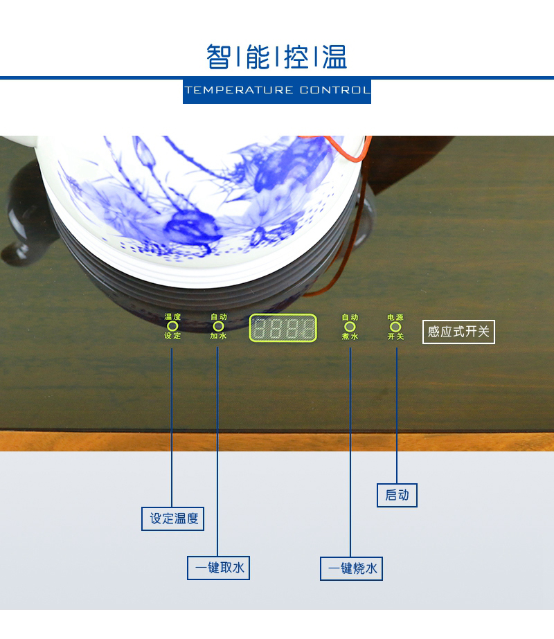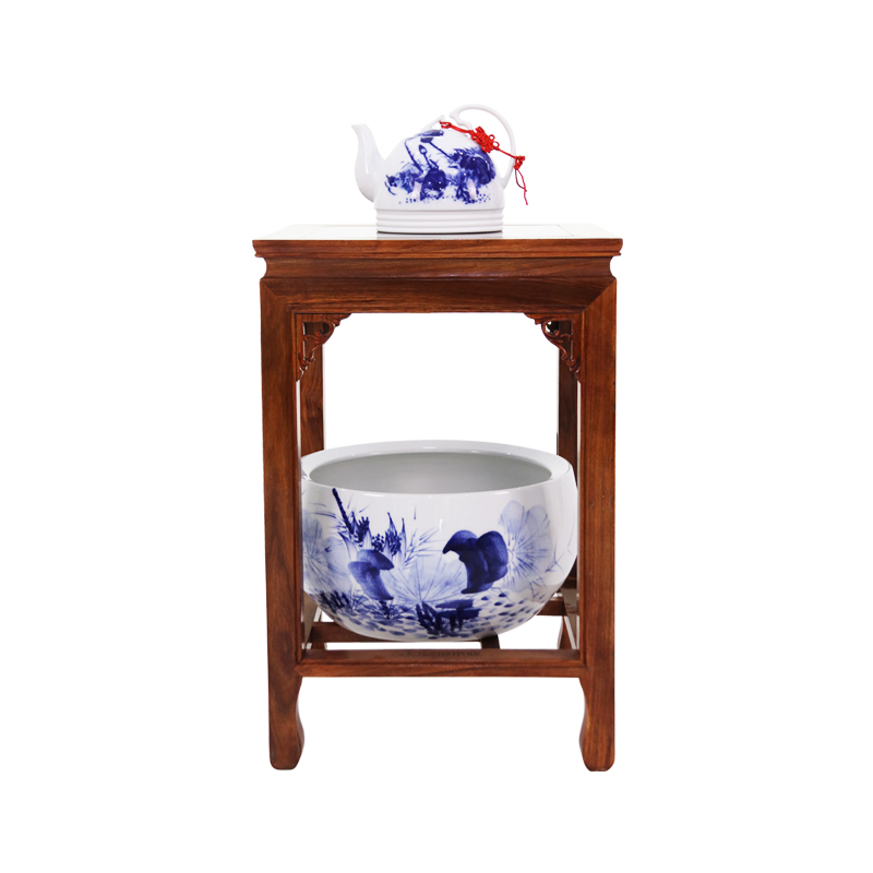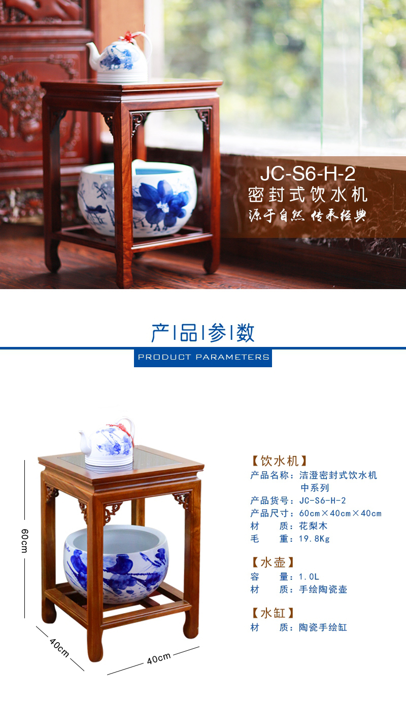 臻品花梨材質(zhì),古色古香、沉穩(wěn)厚重;陶瓷手繪壺、手繪缸,古典優(yōu)雅,光澤耐久。