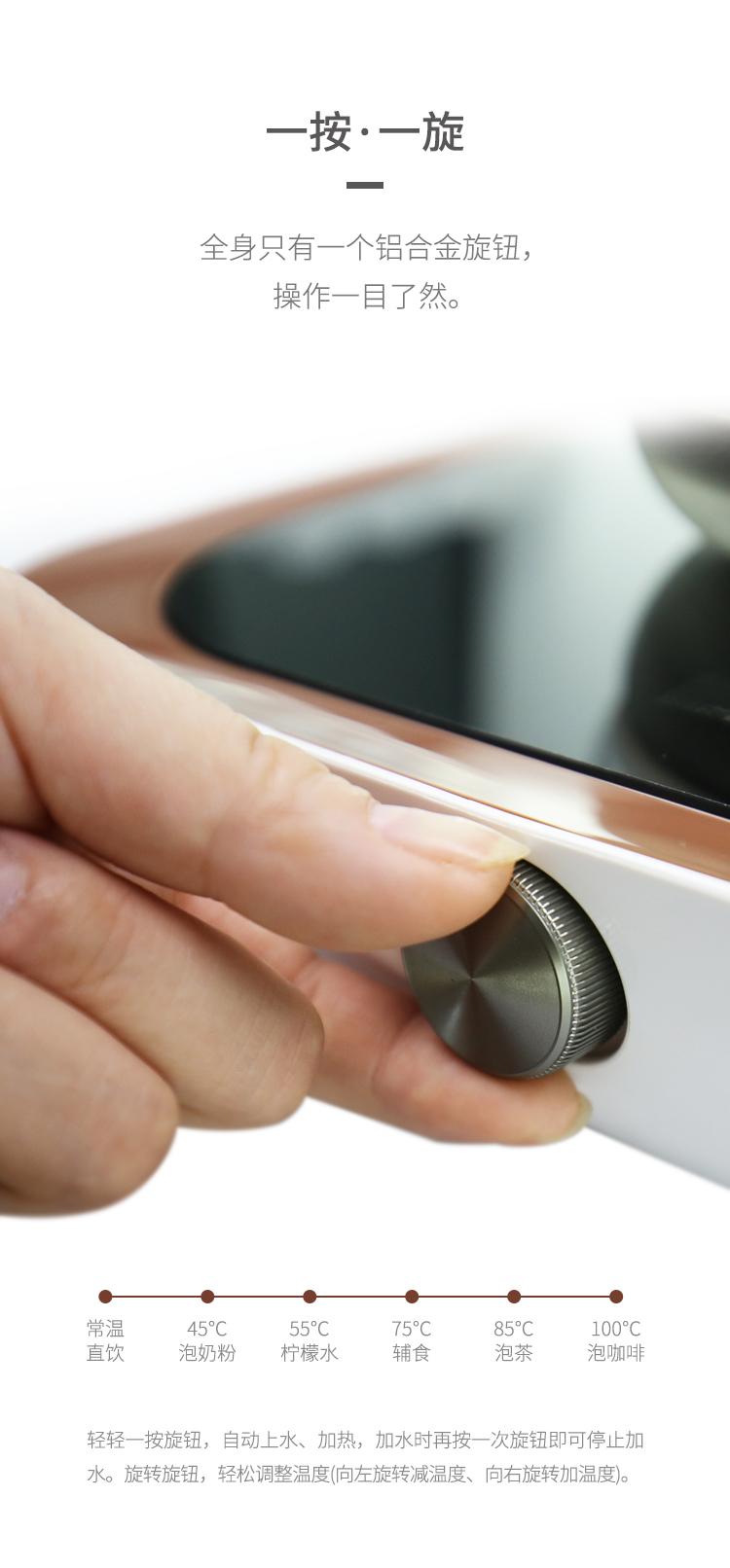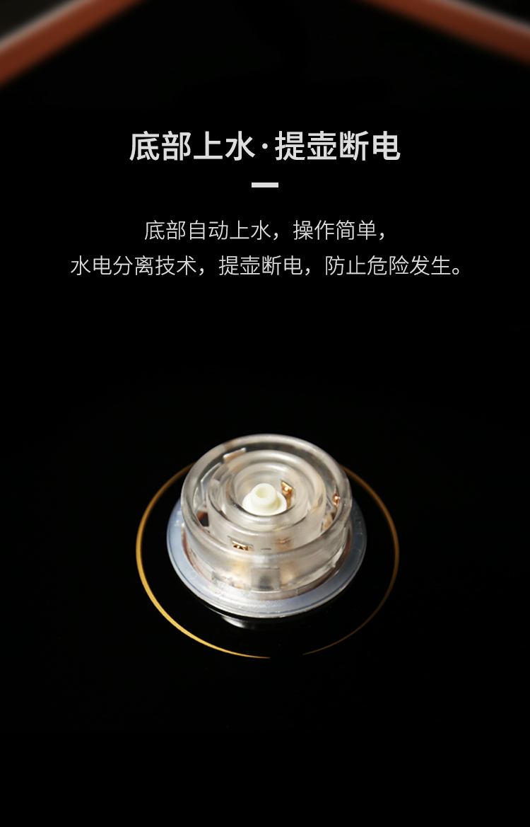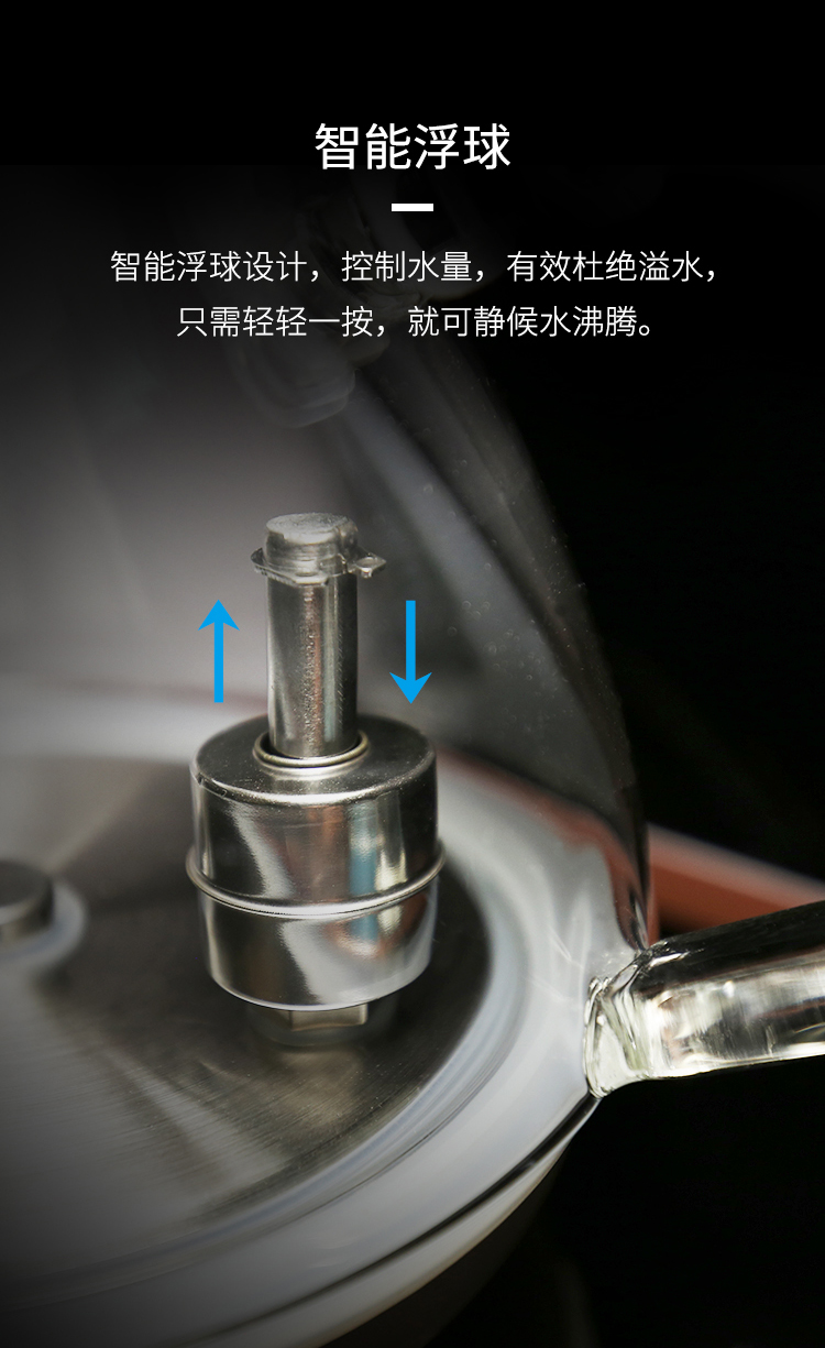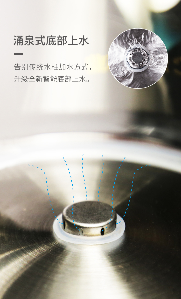 一個鋁合金操作旋鈕,操作一目了然。告別傳統(tǒng)水柱加水,全新升級涌泉式底部上水。智能浮球控制水量,有效杜絕溢水情況。